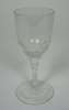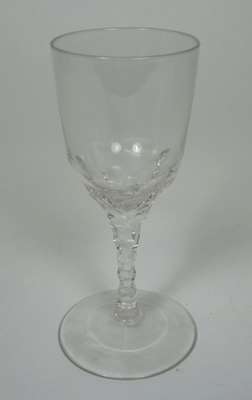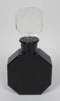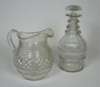 the decanter with knopped neck and cut diamond decoration, 25cm high; the jug of ovoid form with cut diamond and ribbed decoration, 18cm high; together with a small drinking glass with faceted stem, 13.5cm high; and a small octagonal glass perfume bottle, with etched detail to the stopper, 8cm high (4)