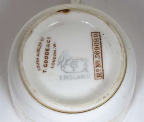 each piece with panels depicting fruit, gilt highlights and blue 'jewelled' decoration, with 'T. Goode & Co.' retailer's marks and the gilded number 'RD No. 569088', some with a further stamped maker's mark, comprising of: 11 tea cups, 11 saucers, two milk jugs of differing sizes, two bowls of differing sizes, 12 side plates and a larger plate (qty)