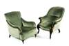 the stuffover shaped back with upholstered arms and seat, raised on carved cabriole legs, together with an edwardian upholstered Howard type armchair, raised on turned legs, both raised on castors (2)