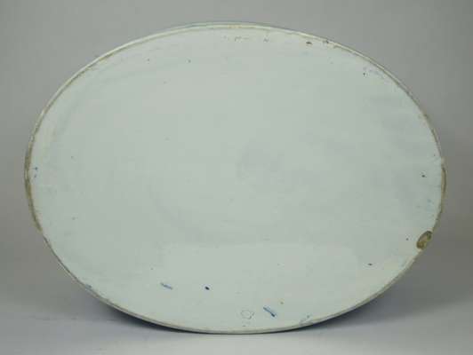 of oval form with twin handles, the transfer printed decoration repeated over the moulded body, the underside with inscribed and printed maker's marks