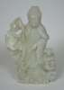 modelled alongside a carved bird and a small figure of Buddha, while holding a bottle with the dew of immortality in her left hand and a horsetail fly whisk in her right hand