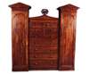 the central section with an anthemion cresting above a moulded frieze above four short drawers above five graduated long drawers, fluted turned wood knobs, flanked to each side with a full height hanging cupboard with pointed cornice