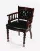 the curved back with buttoned leather back, moulded frame, curved wood arms on circular section supports, upholstered seat and raised on circular section turned legs, brass caps and pot castors