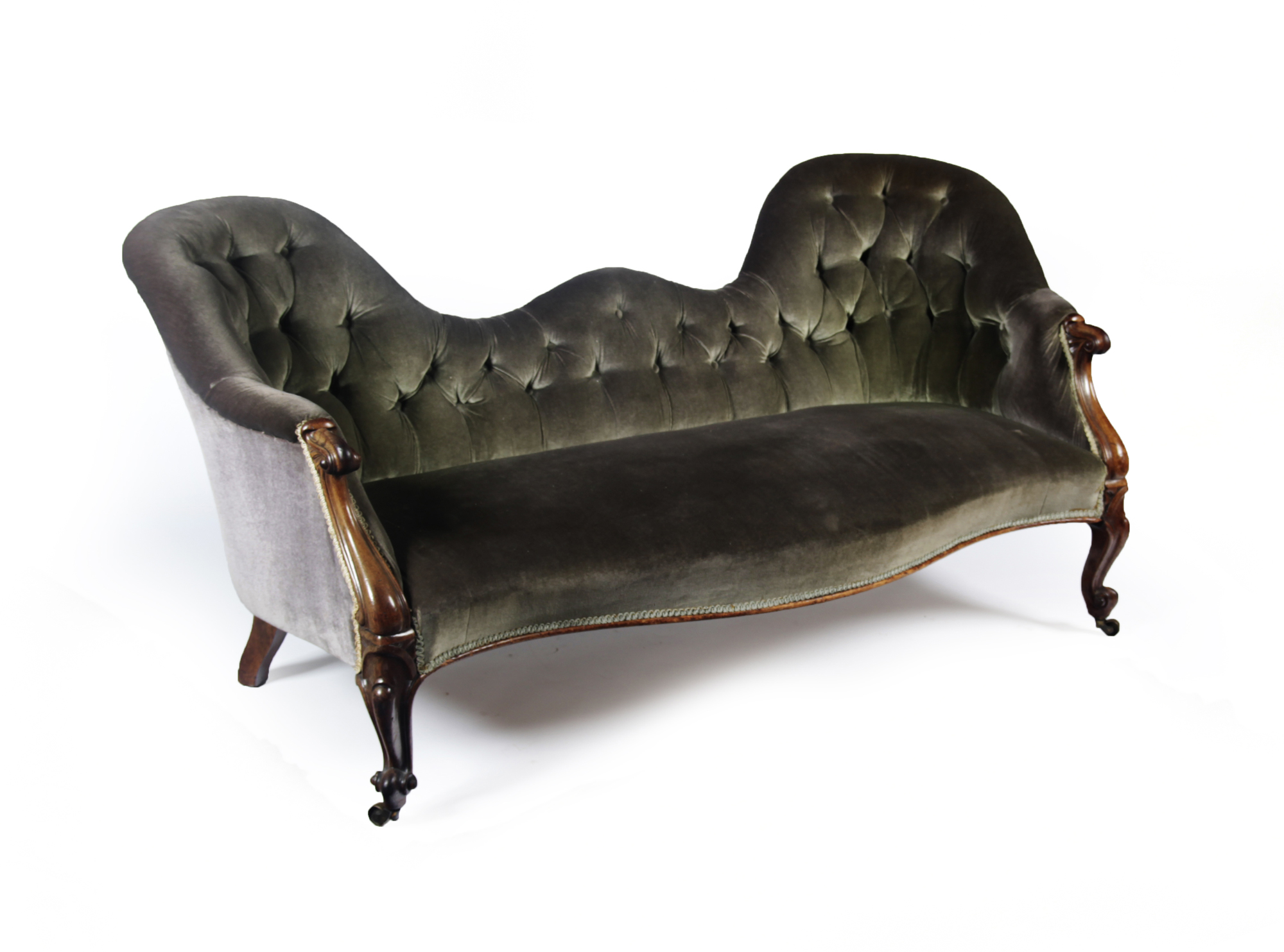 the buttoned double scroll back, with carved showwood arms all, raised on bold cabriole legs