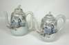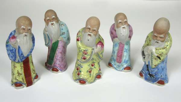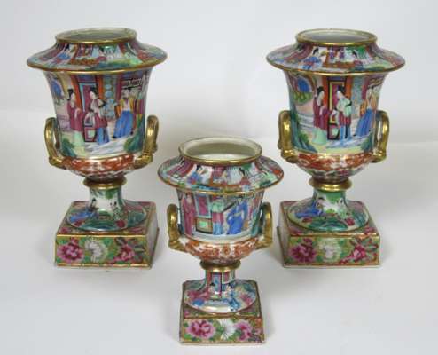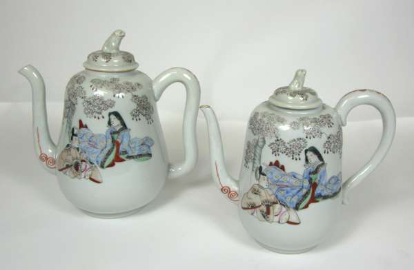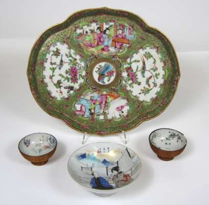 comprising: pair of Chinese famille rose campana shaped vases, with gilt highlights, 18cm high; a smaller Chinese famille rose campana shaped vase, 13cm high; two Japanese coffee pots, each painted with figures below a blossoming tree, 18.5cm high, and 21.5cm high; a small shallow Japanese dish depicting a man being served sake, 11cm diameter; two Japanese wicker covered tea bowls with foliate decoration, 6.5cm diameter; a shaped Chinese famille rose dish, with decorative panels and gilt highlights, 27cm wide; and five Japanese figures modelled as the Seven Lucky Gods, 10.5cm high (highest) (qty)