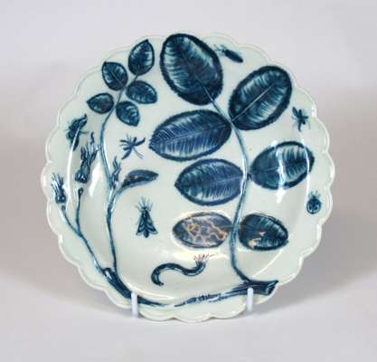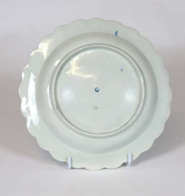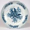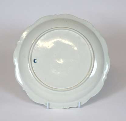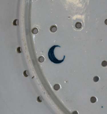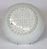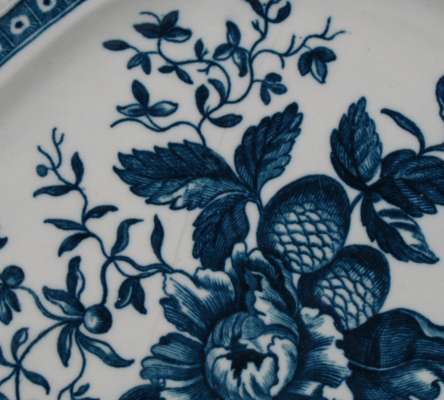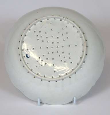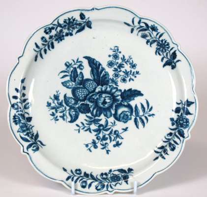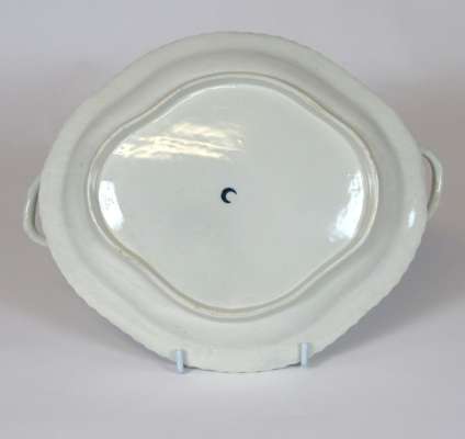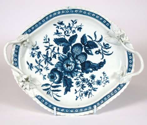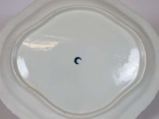 comprising a strainer of circular form with scalloped rim, blue crescent mark, 23cm wide; a plate of similar form, blue crescent mark, 24cm wide; and a dish of shaped oval form with branch handles and applied floral decoration, 27cm wide; together with a WORCESTER BLUE AND WHITE 'BLIND EARL' PATTERN SWEET MEAT DISH, of circular form with scalloped rim, blue crescent mark, 19.5cm wide (4)