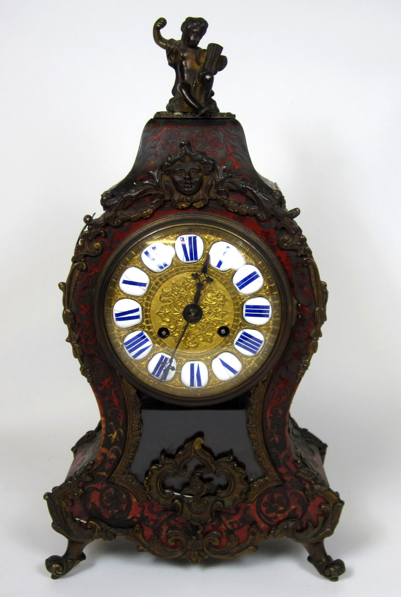 of waisted form in the traditional Louis XIV style, the gilt metal dial with blue and white enamelled chapters below the finial modelled as a figure of time, the movement striking on a gong and inscribed with the retailer's mark 'Edward Bright Paris'
