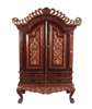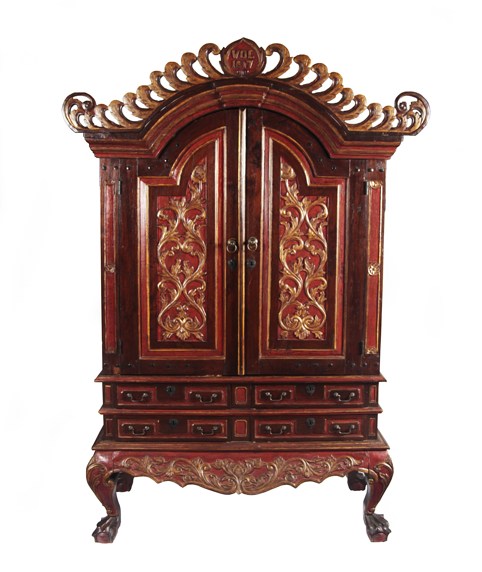 the moulded, carved cornice above arched, carved doors, over four short drawers, and a serpentine apron, raised on carved cabriole legs and ball and claw feet