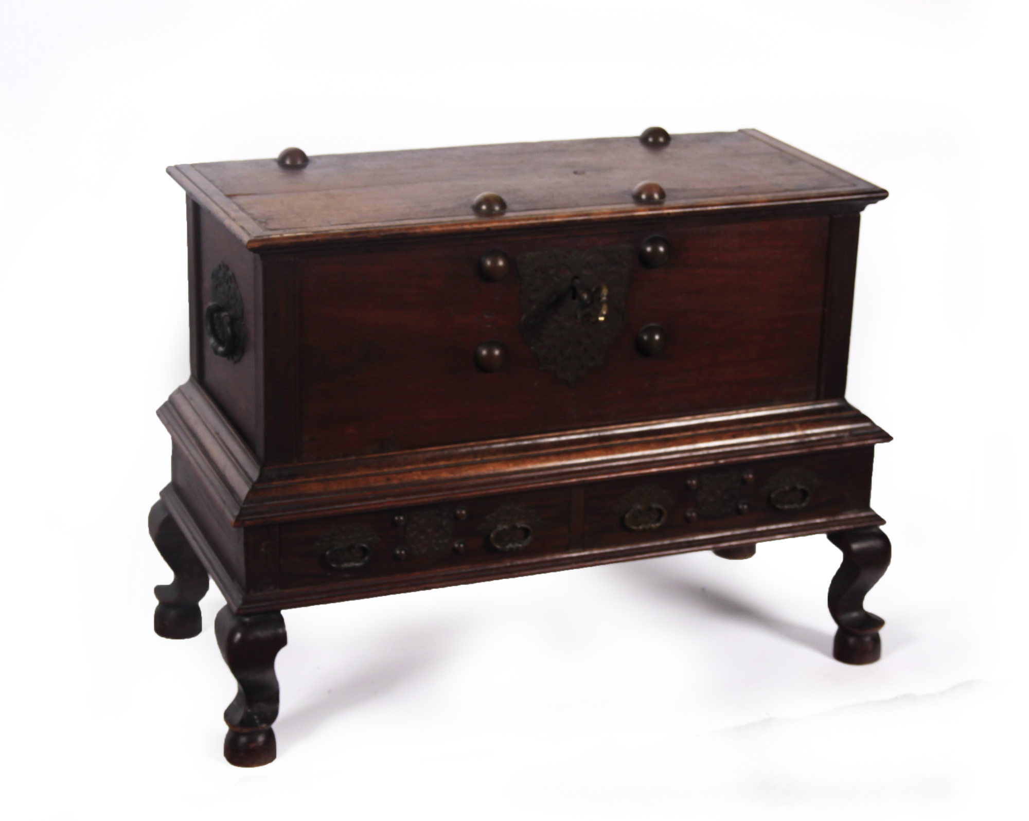 the hinged rectangular top above a fretwork escutcheon, over two drawers raised on cabriole legs