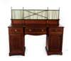 stamped Robson and Sons Newcastle upon Tyne, the Regency style brass rail with urn finials, on a base with satinwood banding, central bow front drawer, and small drawer above a panelled door cupboard to each side, with further satinwood banding, all raised on plinth bases slight shaped detail