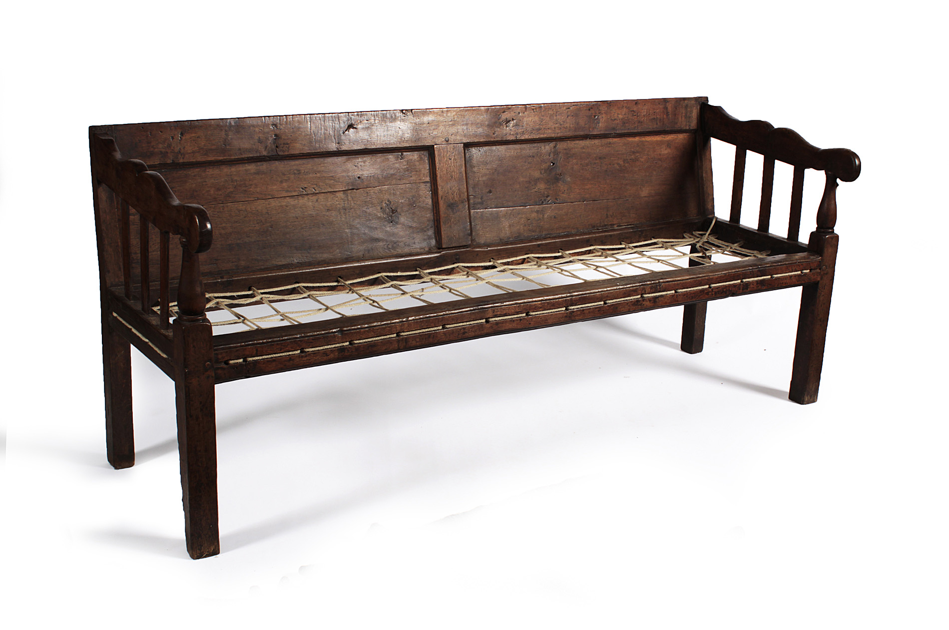 the paneled back over shaped arms, a strung seat, raised on square legs