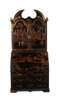 the swan neck pediment above two arched doors, shelved interior on a bureau base with fall front enclosing a fitted interior, above two short and two long drawers, all raised on bracket feet, the whole decorated in Chinoiserie lacquer and gilt