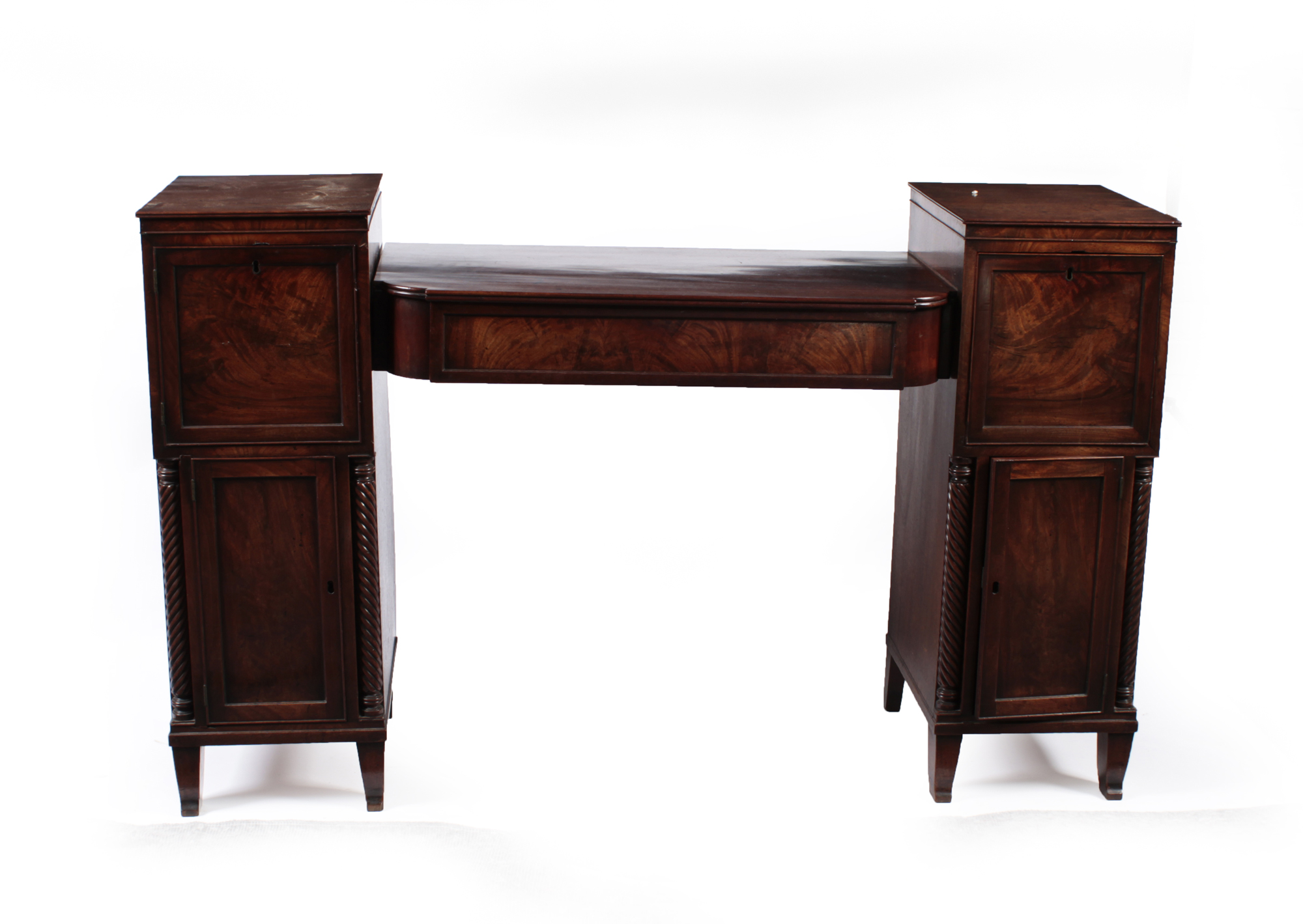 the bow front top over a frieze drawer, flanked by two deep drawers over paneled doors, raised on square tapering legs