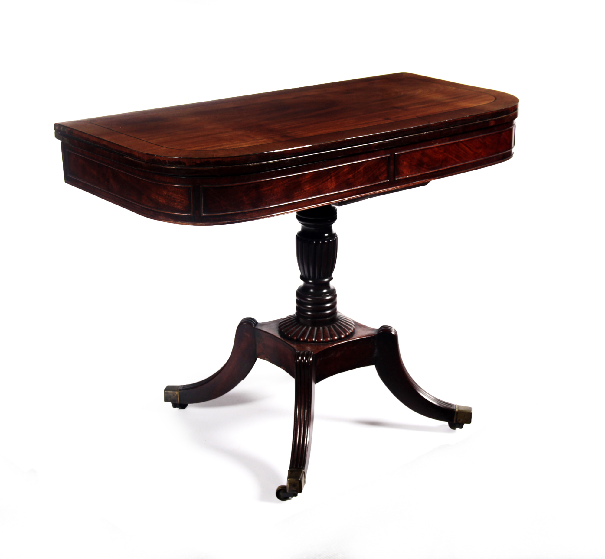 the rounded rectangular ebony strung top with a reeded edge, raised on reeded turned column, terminating in four reeded downswept legs, brass caps and castors