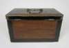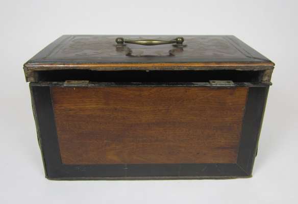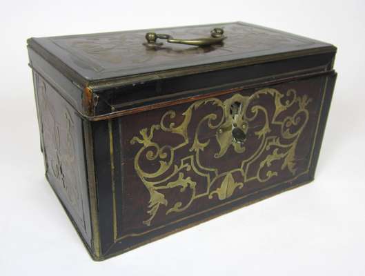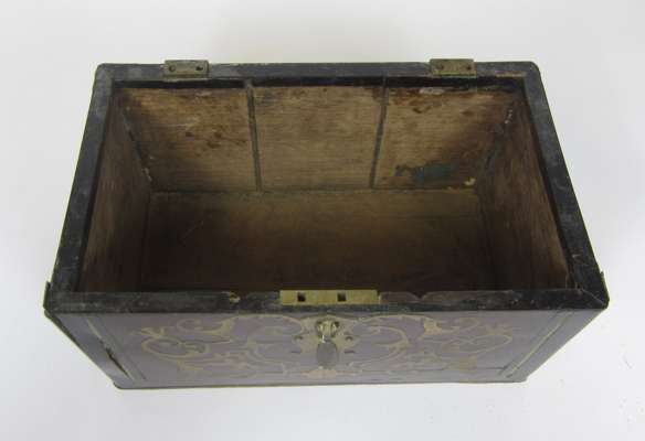 of rectangular form with decorative brass inlaid motifs within wooden veneered borders, the interior void (A/F)