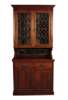 the moulded cornice over a pair of leaded glass doors above a mirror back recess; the lower part with two short drawers above panelled cupboard doors, on a plinth base