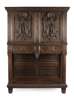 the lunette carved cornice above a pair of architectural doors carved with shells, cupids, and figures in niches, the panelled moulded interior with a shelf, flanked by fluted corners above a pair of moulded drawers with leaf carved edges with cartouches inscribed 'ANNO 1705', raised on fluted front supports joined by an under tier and ending on tapered block feet