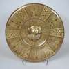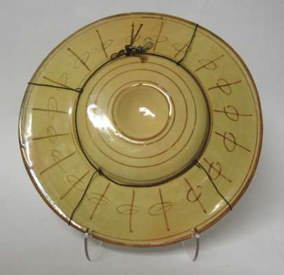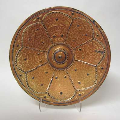 both of shallow circular form, the first with copper lustre decoration depicting an armorial shield within bands of geometric shapes and tree of life motifs, the reverse with lustre decoration, 39.5cm diameter; and the second with red copper lustre decoration amongst blue raised ribs and studs, the reverse with foliate lustre decoration, 40cm diameter (2)