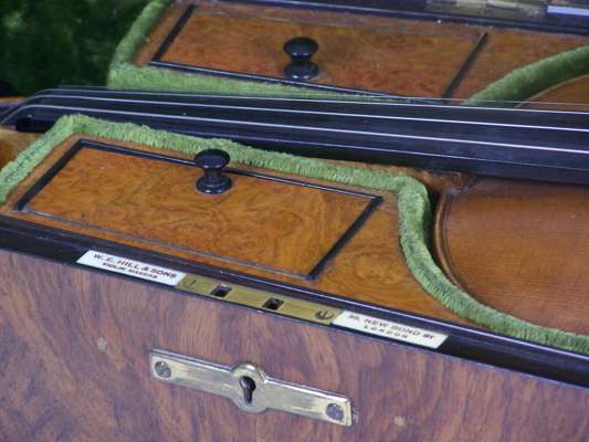 with two piece figured back and labelled 'Andreas Guarnerius fecit Cremona Sub titulo Sanctae Terefiae 1717', with double purfling and rosewood tuning pegs, in a custom made well fitted burr walnut case, the ivory maker's cartouche signed 'W.E Hill & Sons, Violin Makers, 38 New Bond Street, London', the plush green velvet and burr veneered interior with three lidded compartments and two bows
