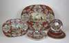 each piece decorated with figures in a landscape, surrounded by foliate borders and panels on a orange coloured ground, comprising of: an ashet, two shaped dishes, a meat drainer, and 13 plates and dishes, each of assorted shape and size (qty)