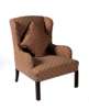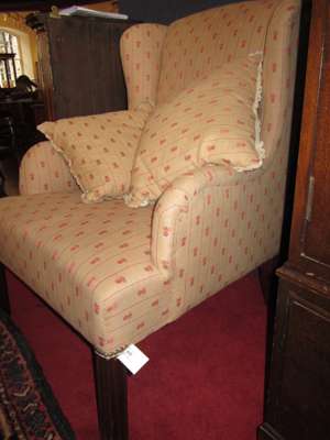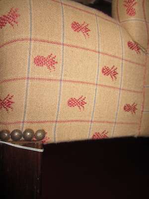 the upholstered back seat and wings in pineapple print material and raised on moulded square section legs and two matching scatter cushions