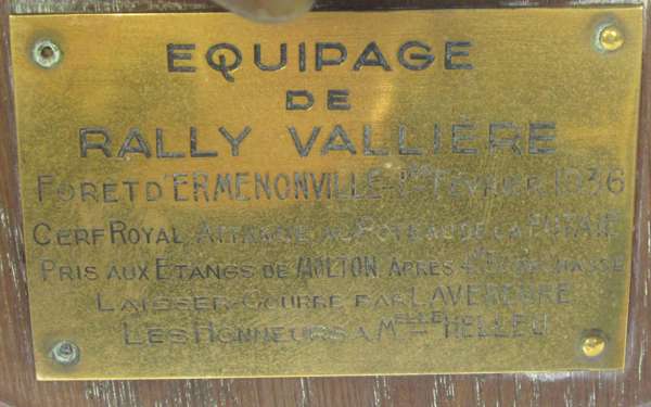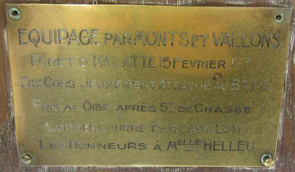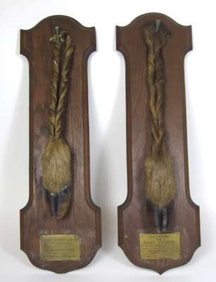 unmarked, each with a simple circular sconce above the tapered baluster stem, with hoof mounted base, 31cm high; together with a PAIR OF MOUNTED DEER HOOF TROPHIES, with inscribed brass plaques 'Les Honneurs A Melle Helleu', 56cm high (4)