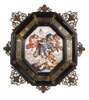 the octagonal plaque, 19cm x 23cm, depicting Diana in a chariot attended by putti and maidens, in a baroque style gilt metal and ebonised frame set with hardstone medallions