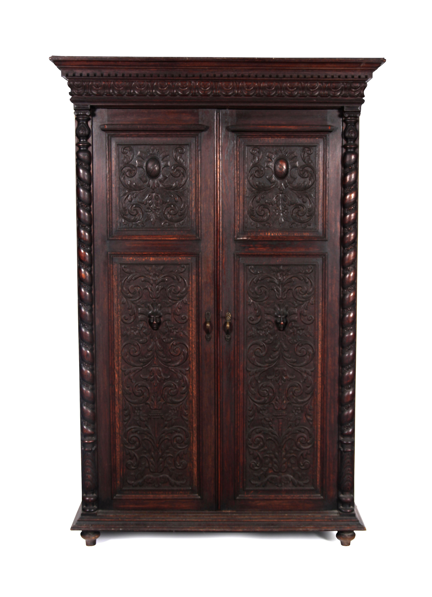 the dentil moulded cornice above two carved panel doors flanked by spiral carved pilasters, raised on a plinth base and bun feet