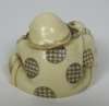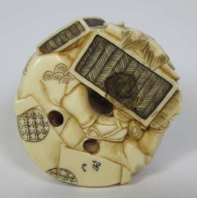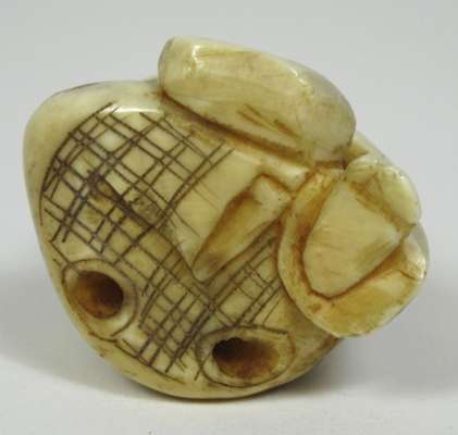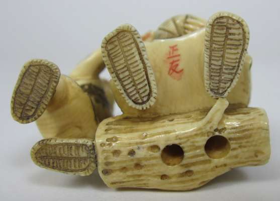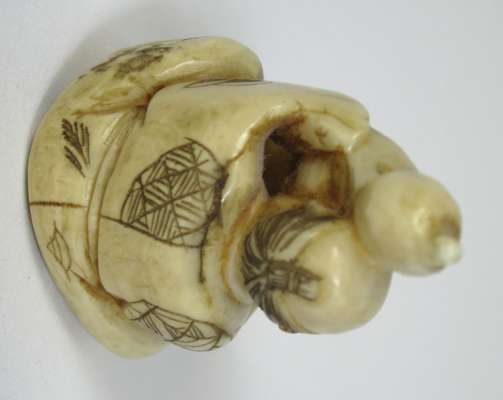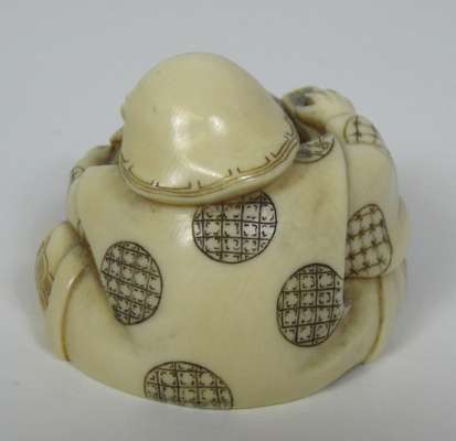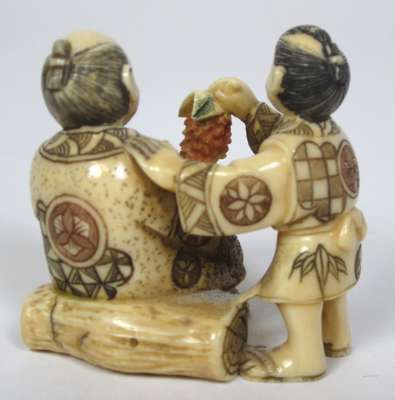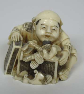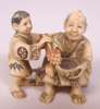 comprising of: a seated figure modelled with an open chest of objects, signature to underside, 3.5cm high; a figure group modelled as an elderly man and boy with a bunch of grapes, signature to underside, 4cm high; and a naively carved seated figure modelled with a fan and gourd, 5cm high (3)