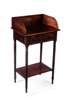 the rectangular top with a three quarter tall gallery, full width frieze drawer, platform base, all raised on slender ring turned legs