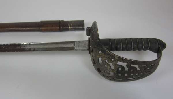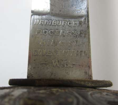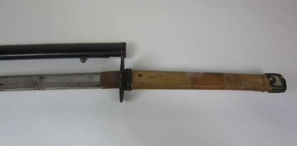 blade signed 'Hamburger Rogers & Co', etched blade (heavily rusted), in leather scabbard, 89cm long (blade); together with a JAPANESE SWORD in lacquer scabbard, grip lacking, 65.5cm long (length of blade) (2)