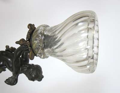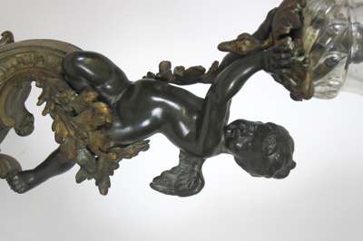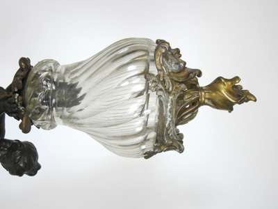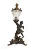 modelled as a putto holding aloft a glass shade with a bronze cover, on a rococo scroll triform standard and green marble base