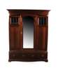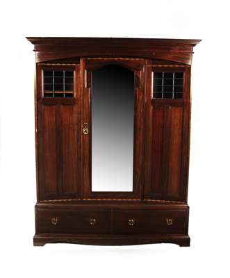 comprising a dressing table; the upright long mirror on three drawer pedestals raised on a long drawer base, drawer stamped 'Warings' the wardrobe with moulded cornice, arched apron with recessed central mirror dood flanked on either side by panel with chequer, leaded glass panels, two drawer base, shaped apron