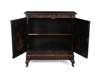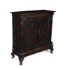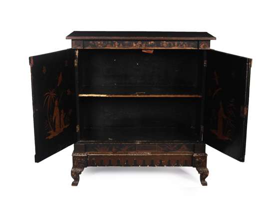 the rectangular top above a gilt decorated frieze above a pair of panel doors with Chinoiserie lacquer and gilt scene of a garden scene, the interior with gilt figural decoration, similar decorated sides with carry handles, all on a gilt stand with decorated cabriole legs