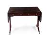 the rectangular top with rounded flaps, two frieze drawers, dummy opposing frieze drawers, brass knobs, plain trestle uprights, downswept legs, brass caps and castors