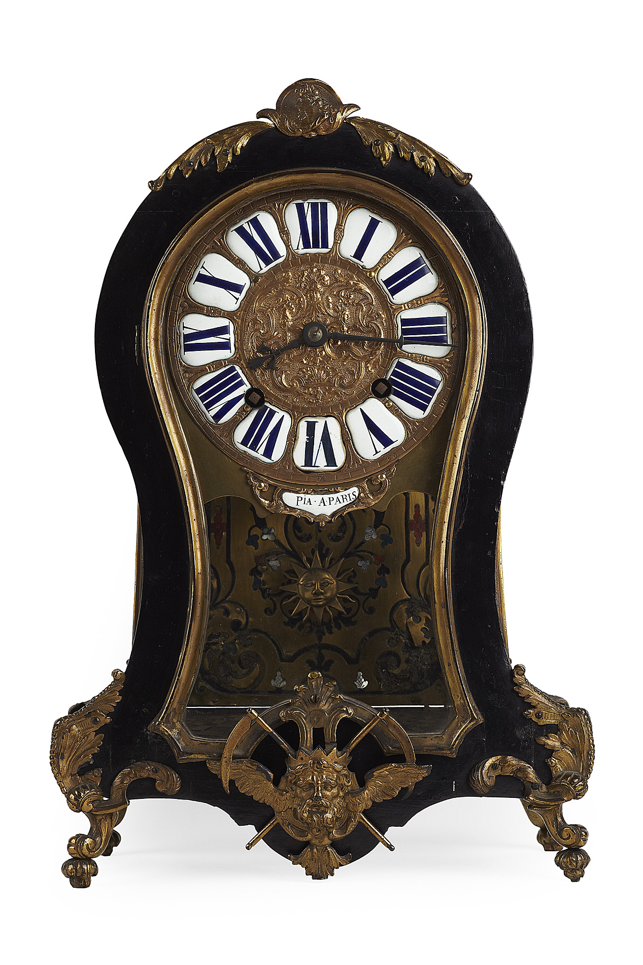of balloon form with bronze mounts, the gilt dial and engraved backplate signed 'PIA, A PARIS' with white enamel chapters and raised on scroll feet