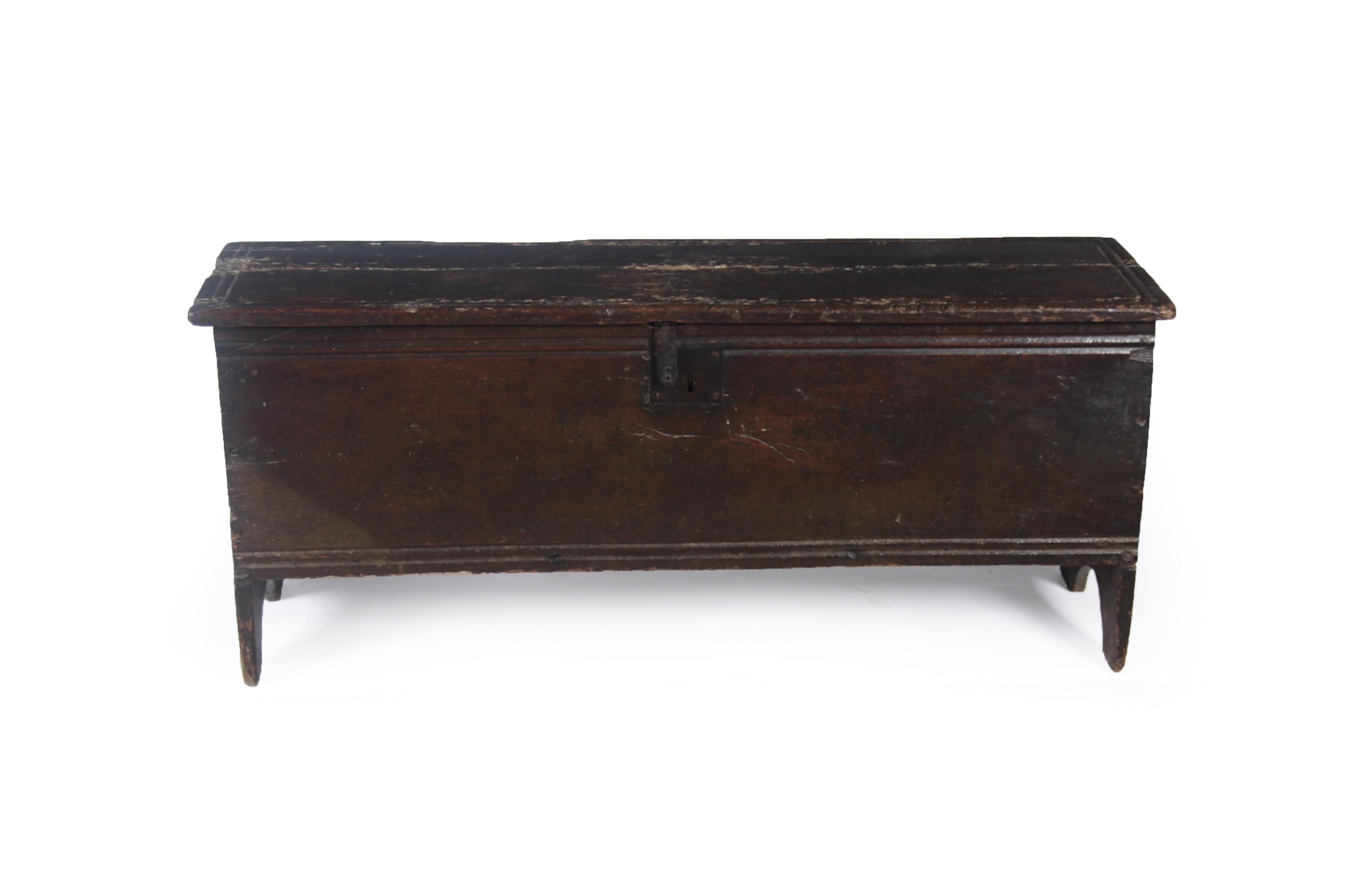 the plain plank top with slight line carved edge, plain front and sides, simple hasp and lock