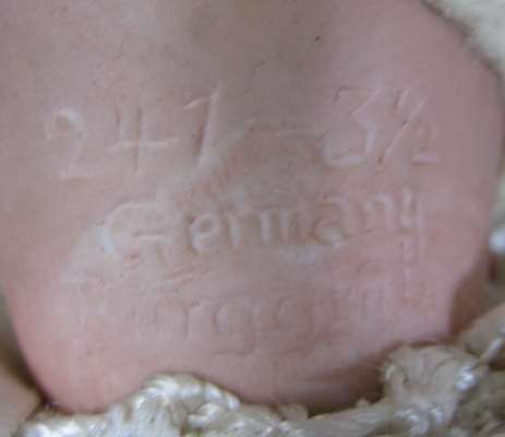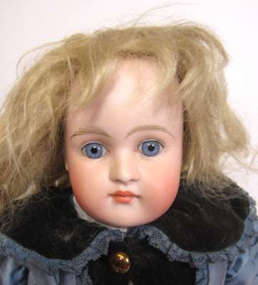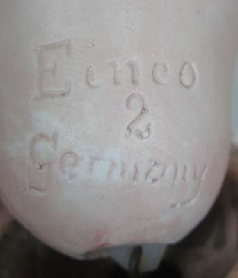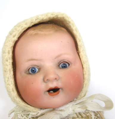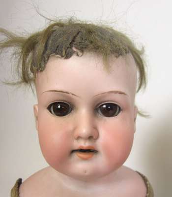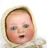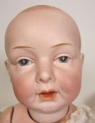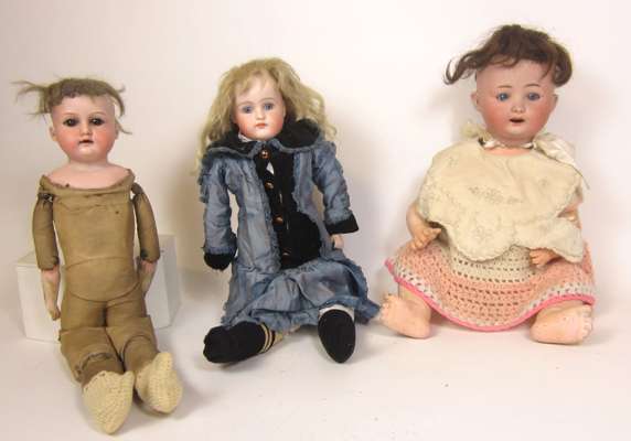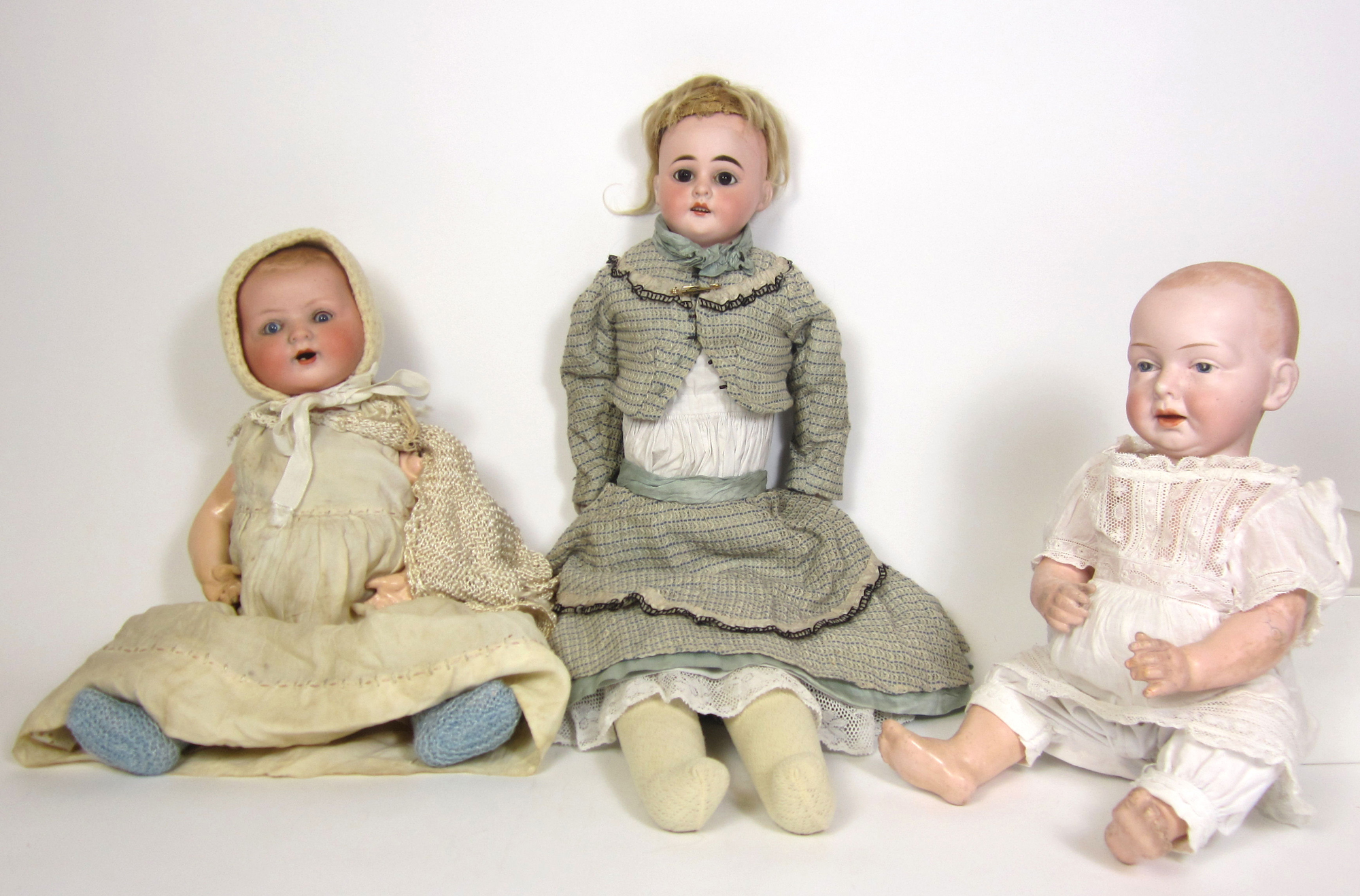 with painted features, marked 'Einco 2 Germany', on bent limb composition body, 37cm long; together with FIVE BISQUE HEADED DOLLS (6)