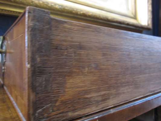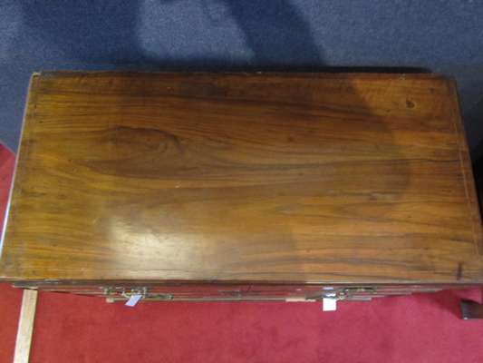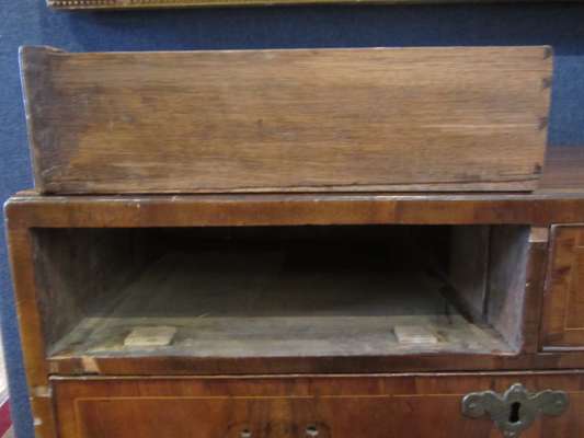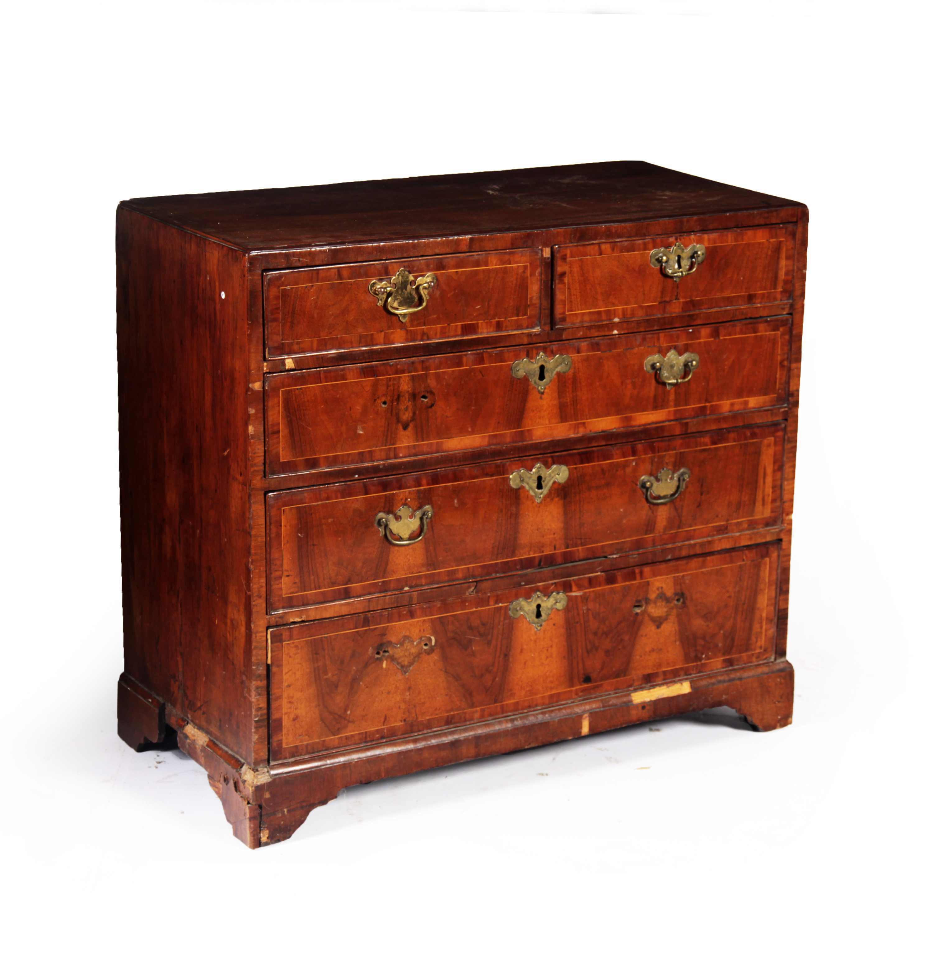the caddy top above two short and three long crossbanded drawers, brass loop handles and shaped back plates, raised on bracket feet