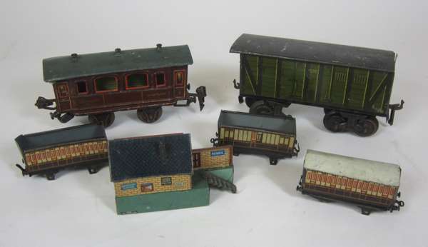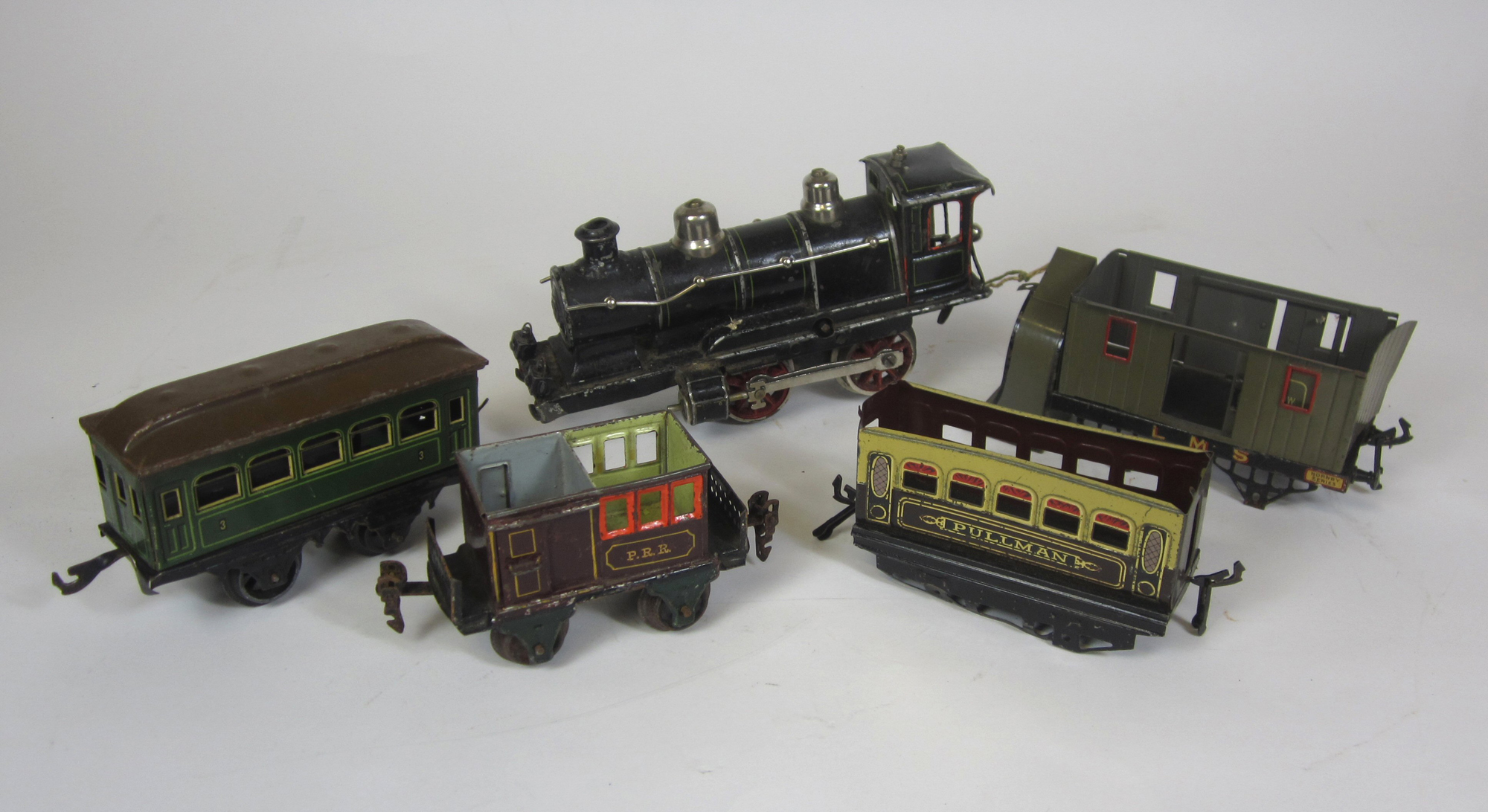 comprising of: a P. R. R., Marklin luggage van; a Pullman carriage; a Hornby Series LMS snow plow; a Gesellschaft Speisewagen carriage; a locomotive; and various other toy trains; together with a COLLECTION OF TOY TRAIN TRACKS (qty)