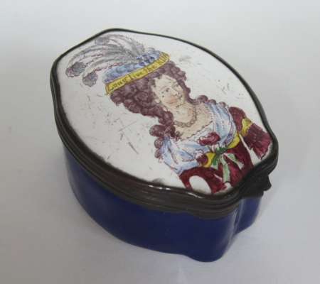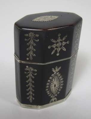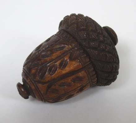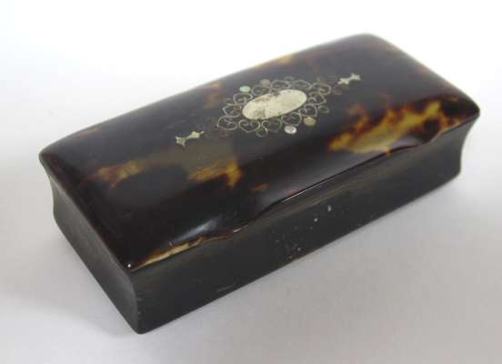 modelled as an acorn, with a screw off lid and a pierced steel grater, 6.5cm high; together with TWO TORTOISESHELL SNUFF BOXES, the first of canted cylindrical form, inlaid with white metal motifs, 5.5cm high; the second, of rectangular form, with mother-of-pearl and white metal inlaid motifs, 7.5cm wide; and an ENAMELLED PATCH BOX, decorated with an elegant lady and the inscription 'Long live the King', 5cm wide (4)