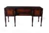 the reeded rectangular top above central frieze drawer and recessed linen drawer with a cellarette cupboard to each side, all raised on projecting circular section and reeded legs, ball and square feet