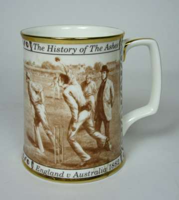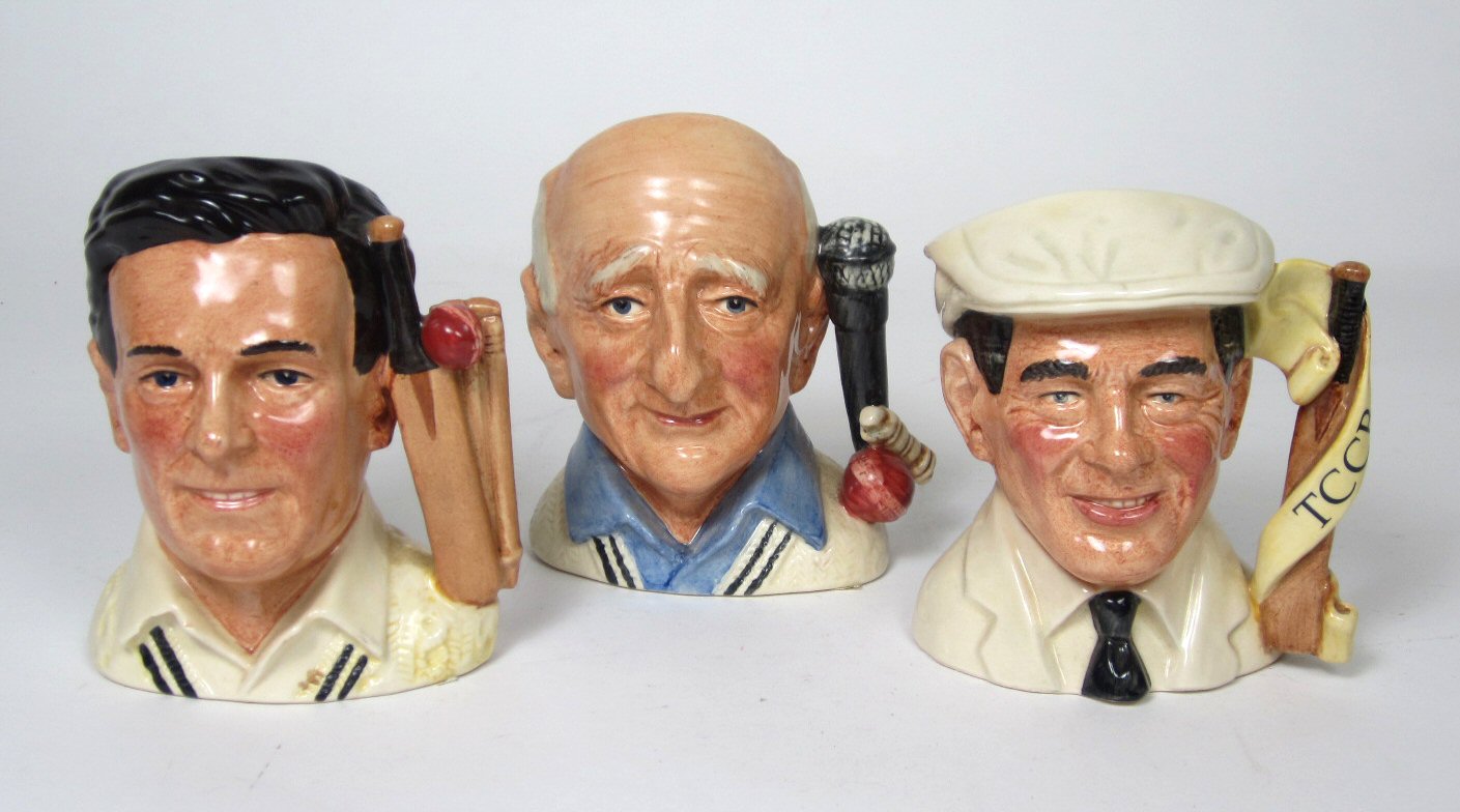 comprising: Sir Stanley Matthews, no. 202; W. G. Grace, no. 3955; Ian Botham, no. 965; Eddie Trueman, no. 550; Jack Hobbs, no. 262; 'Johnners' Brian Johnston, no. 391; 'Dickie' Bird, no. 3323; Len Hutton, no. 1826; and Denis Compton, no. 390; together with a ROYAL DOULTON TANKARD, 'The History of the Ashes', no. 0153, 12.5cm high (10)