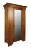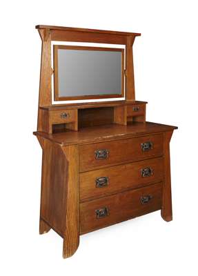 of tapering outline with planked construction, comprising a WARDROBE, the projecting cornice above single mirrored door with stamped copper hinges, 109cm wide, 186cm high, 50cm deep; and a matching DRESSING CHEST, with swing mirror above two jewellery drawers and an open shelf with three long drawers below, 107cm wide, 79.5cm high, 46cm deep (2)
