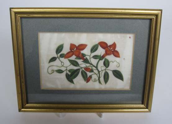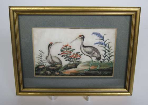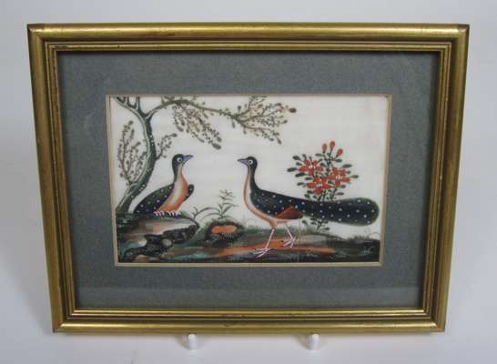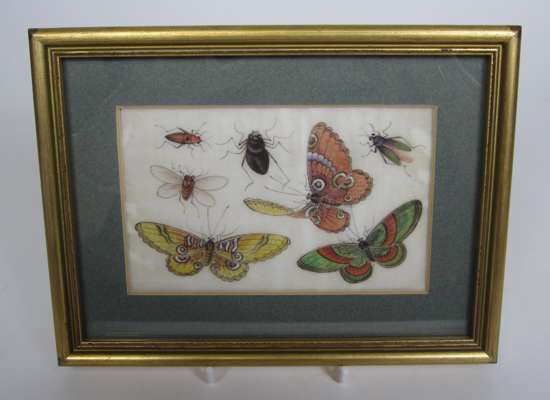 in various sized glazed frames, comprising of: a pair depicting an Emperor and Empress, on paper; a pair showing a female and male figure, with attendants on rice paper; a pair depicting men in robes on rice paper; and a set of six, depicting flowers, birds and butterflies, on rice paper (12)