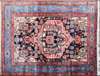 the dark indigo field with central rose, lemon and indigo medallion, lemon and light blue spandrels, within blue turtle palmette and vine border between bands
