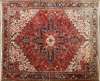 the red field with central indigo, red and ivory cruciform medallion, ivory spandrels, within indigo turtle palmette and vine border between bands