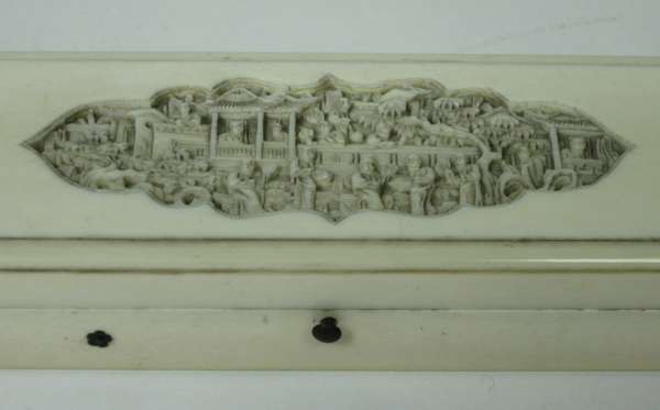 of rectangular form, decorated with a reserve in relief depicting figures amongst foliage