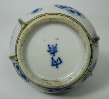 the ovoid base mounted with white metal, painted with an exotic bird and blue character marks to underside, supporting the bamboo pipe