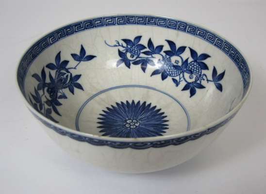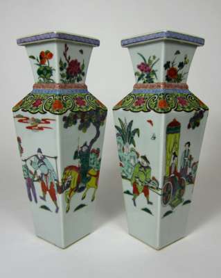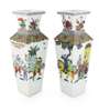 each of square baluster form, decorated with figures below foliate motifs and borders, 30cm high; together with a CHINESE BLUE AND WHITE PORCELAIN BOWL, decorated with foliate motifs and stylised borders, 17.5cm diam (3)